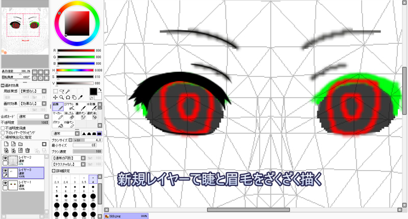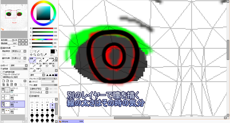 別レイヤーで瞳を描きます。これも分かりやすいように蛍光色。